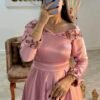 يتميز الموديل بأكمام "بوف" (Puff) طويلة تضفي لمسة من الفخامة الكلاسيكية، مع صف من الأزرار الأمامية الممتدة التي تعطي تفصيلاً جمالياً فريداً وقصة تبرز جمال القوام بكل رقيّ.