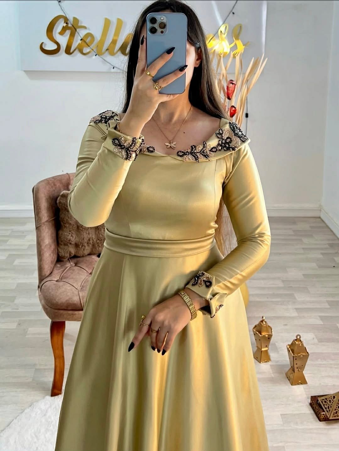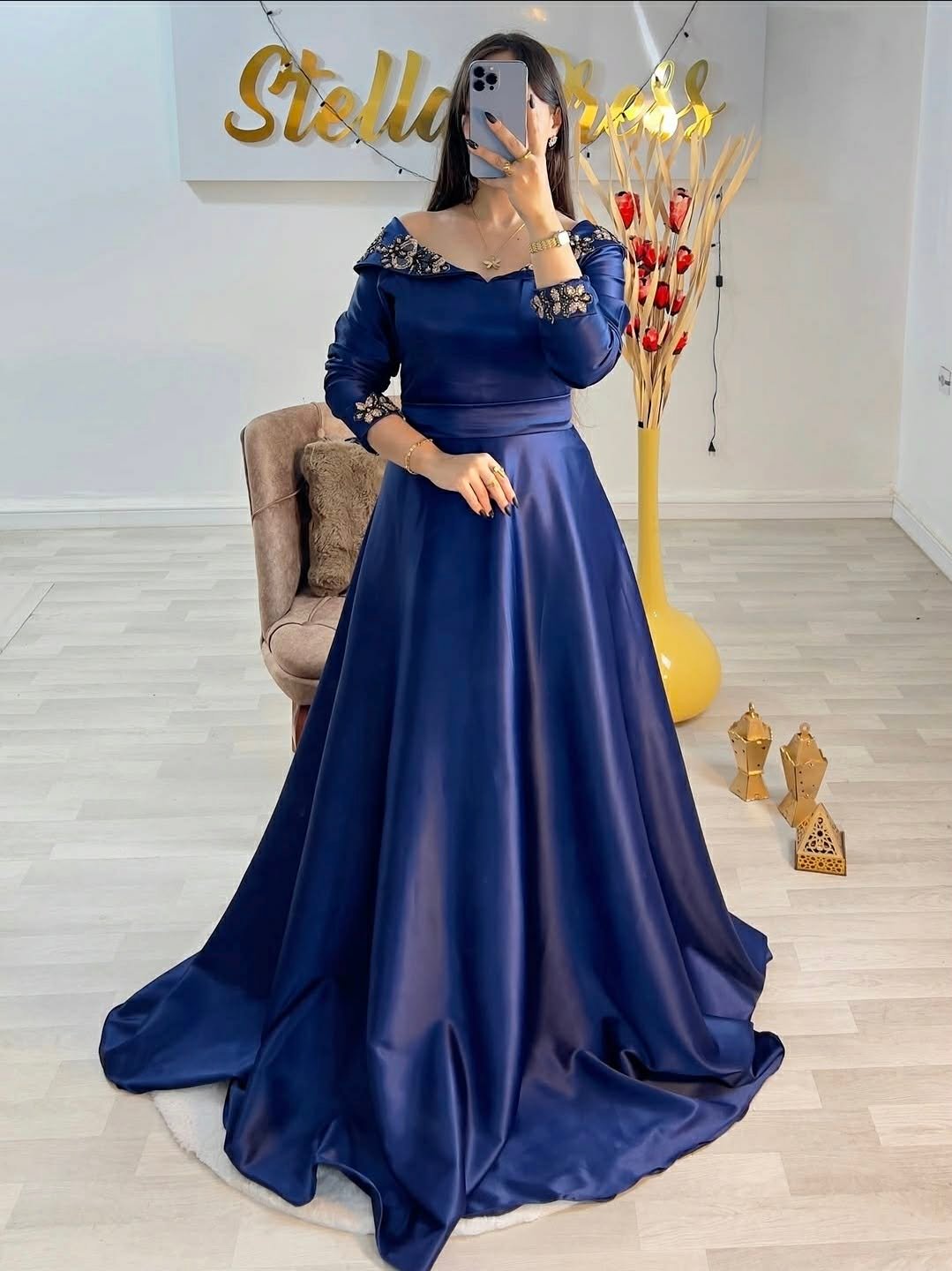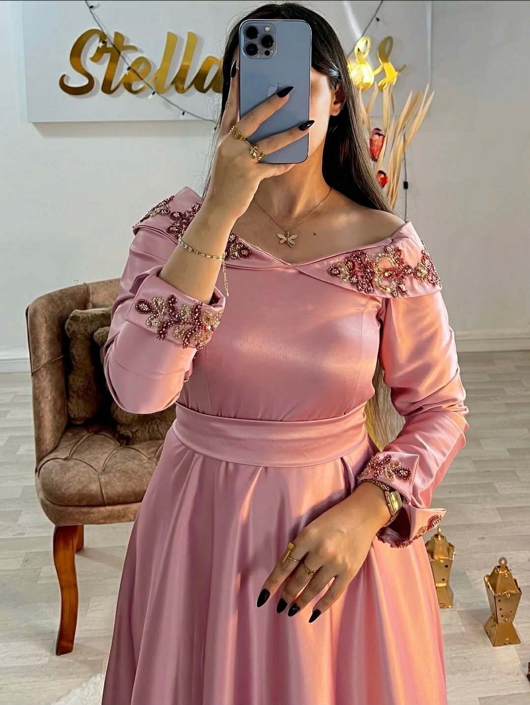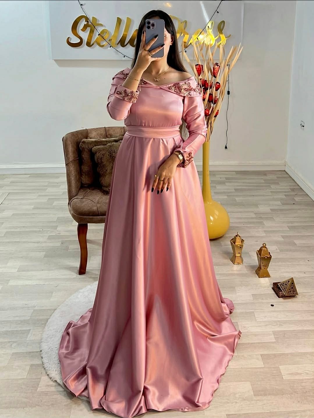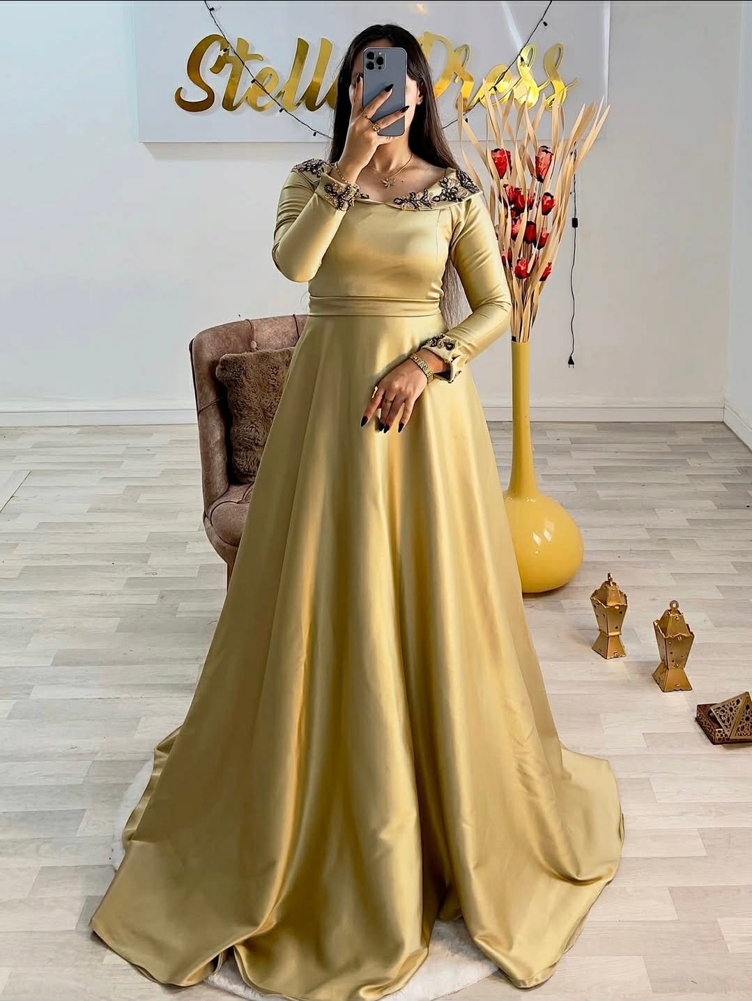 العلامة التجارية: Stella Dress بلد الصنع : الجزائرالقماش : ساتان ملكي فاخر (Satin Royal) المقاسات : من 36 حتى 52 الألوان المتوفرة : Grenad | Vert | Beige التوصيل : متوفر لجميع الولايات (58 ولاية)