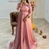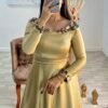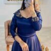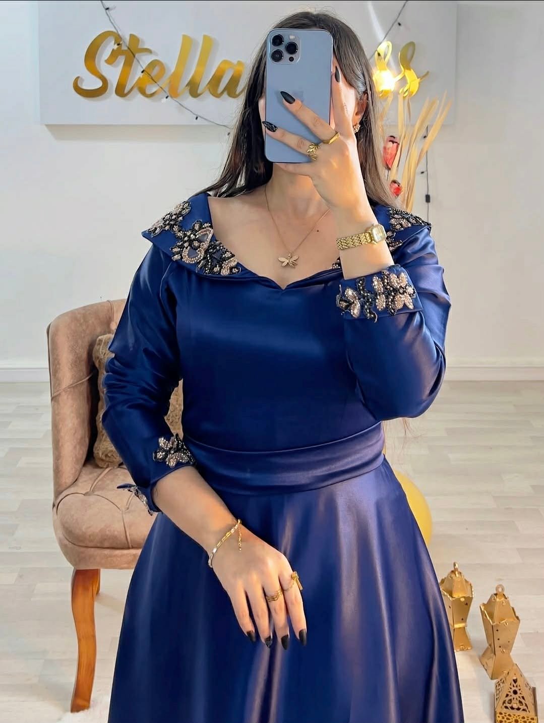 أناقة ملكية تتجسد في تصميم يجمع بين الرقيّ والعصرنة. مصنوع من قماش الساتان الملكي الفاخر الذي يتميز بلمعته الحريرية الجذابة، ومزين يدوياً بأحجار الكريستال اللامعة التي تزيّن الياقة المربعة وحزام الخصر لتمنحكِ بريقاً يخطف الأنظار.